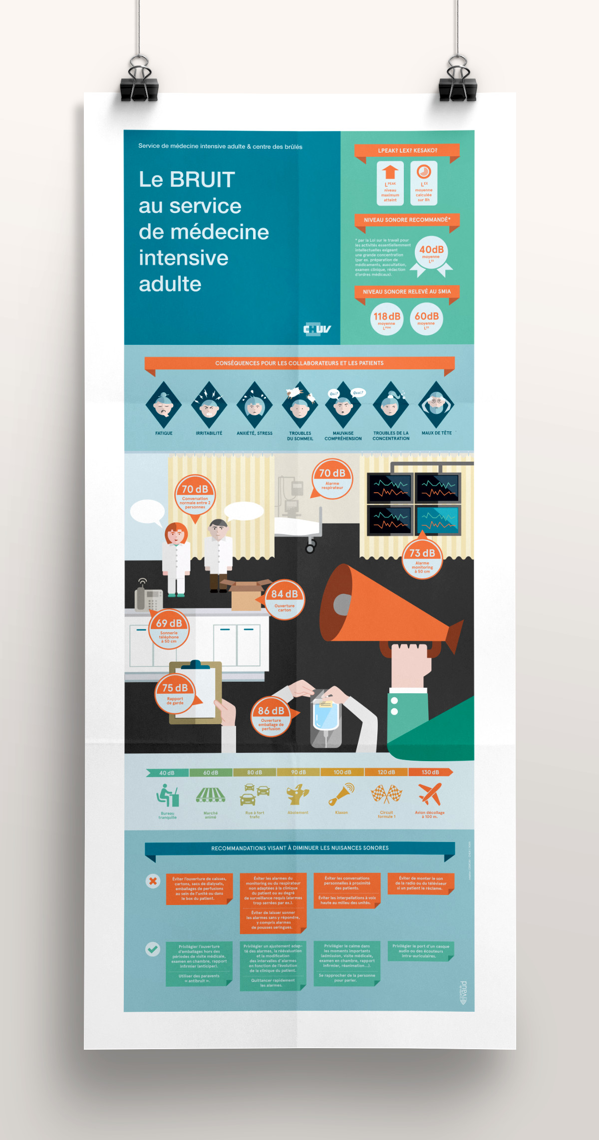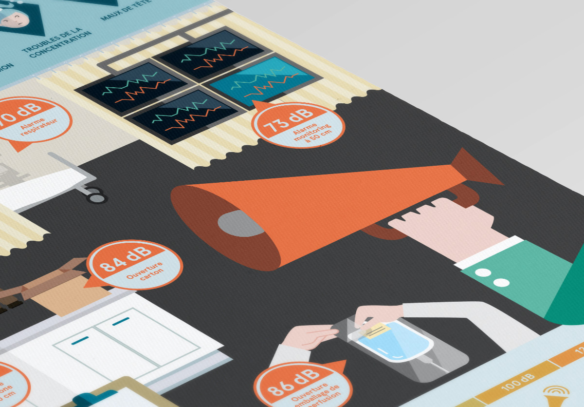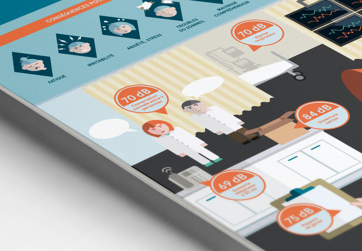 Création d’une infographie expliquant les problèmes liés au niveau sonore trop élevé au service de médecine intensive du CHUV. Elle donne également des recommandations visant à diminuer les nuisances sonores.
